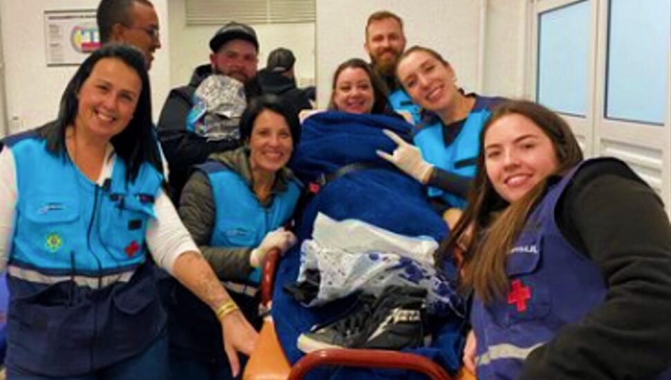 Empolgada com a situação inusitada, a equipe dos Bombeiros que atendeu a família fez questão de registrar o momento com uma foto ao lado da mãe e do filho, que não vai poder não gostar de heavy metal quando crescer. Joice e Luan foram encaminhados para o Hospital e Maternidade Santa Brígida.