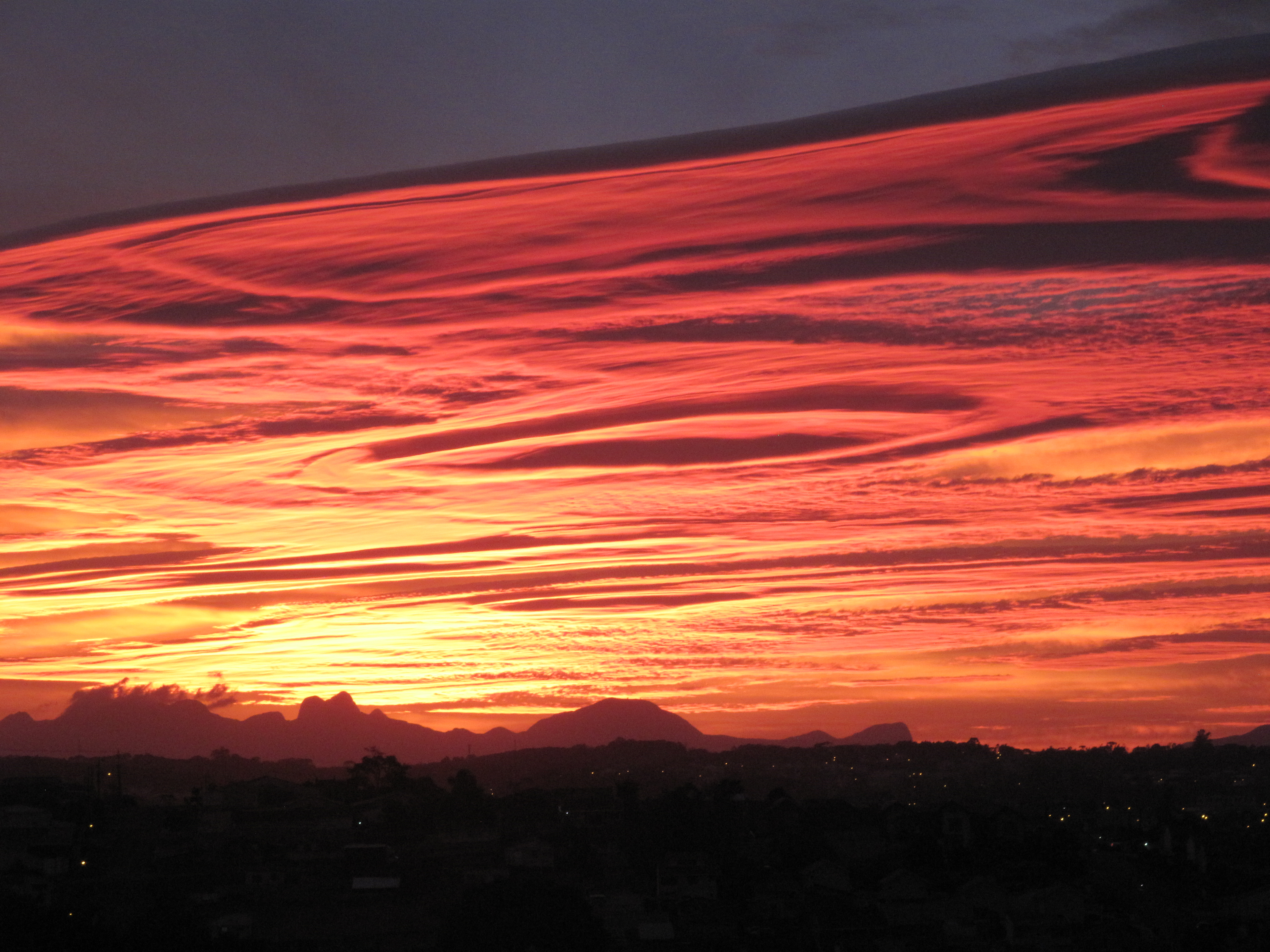 Quem viu os primeiros momentos do amanhecer desta quinta-feira (8), em Curitiba, se surpreendeu com o céu em tom carmesim - um vermelho forte e brilhante num céu que há dias vinha sendo ofuscado por nuvens cinzentas e pesadas que trouxeram grandes volumes de chuva para a capital. Mas não foi só isso que fez o amanhecer mais bonito para os curitibanos: o formato arredondado e alongado das nuvens também chamou a atenção de quem se deparou com o nascer do sol.