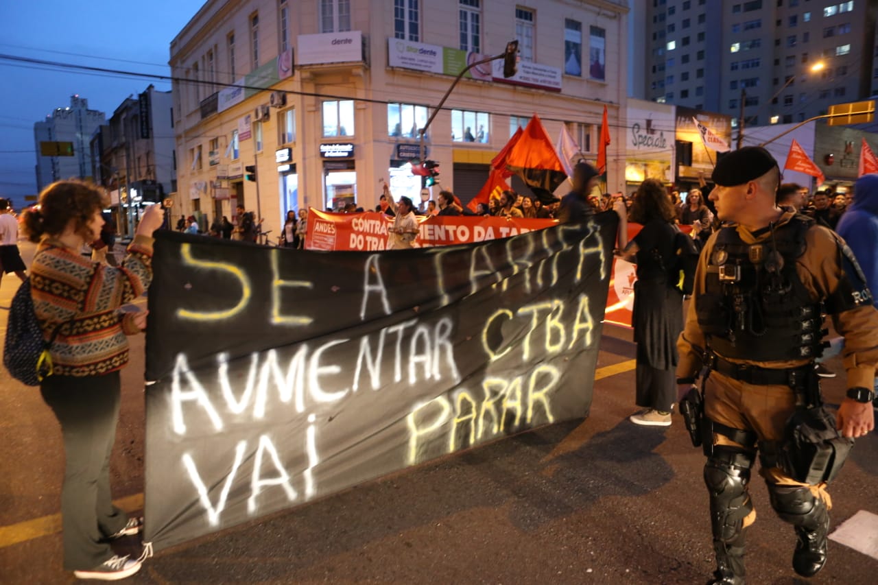 Dezenas de manifestantes fazem um ato no Centro de Curitiba contra o aumento da passagem de ônibus na capital na noite desta terça-feira (26). O protesto começou na Praça Rui Barbosa e o grupo seguiu pela Rua André de Barros em direção ao terminal Guadalupe, por volta das 19h40. O trânsito teve bloqueios temporários e causou lentidão na região. A tarifa vai subir de R$ 4,25 para R$ 4,50 na próxima quinta-feira (28).