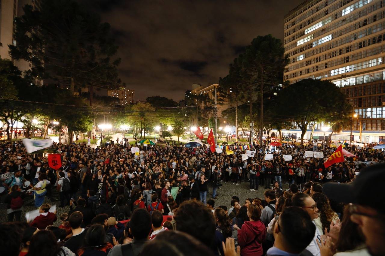 Centenas de manifestantes se reuniram na noite desta quarta-feira (08) em frente ao prédio histórico da Universidade Federal do Paraná (UFPR), no Centro de Curitiba, para protestar contra o bloqueio de verbas a universidades e institutos federais de todo o país anunciado na semana passada pelo Governo Federal. Este é o primeiro de uma série de atos organizados por estudantes para os próximos dias — inclusive durante a visita do presidente Jair Bolsonaro (PSL) à capital paranaense nesta sexta-feira (10).
