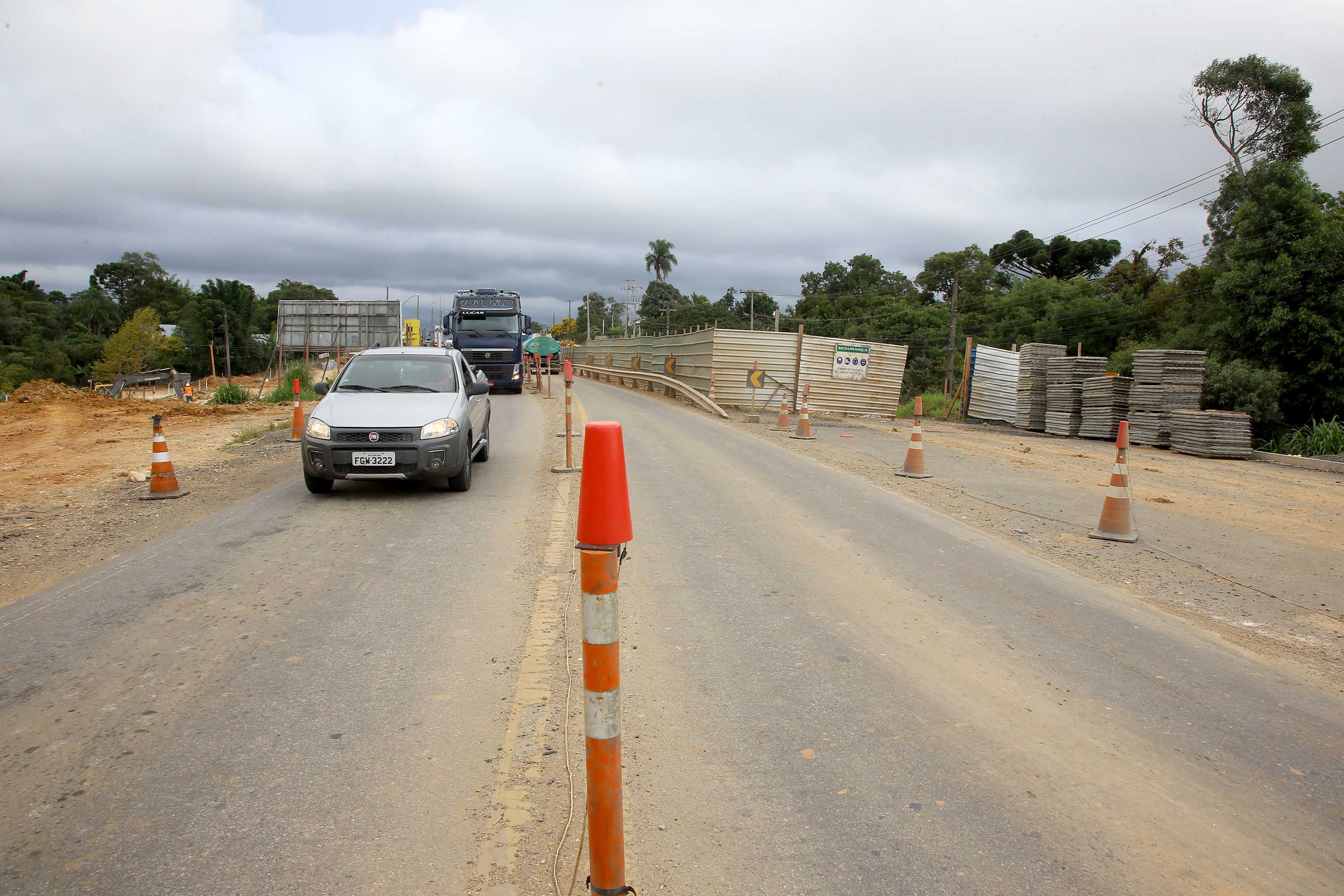 Por causa da obra, já funciona no local um desvio pelo acostamento, que precisará ser interrompido para um caminhão munck fazer o içamento das vigas para o viaduto do lado esquerdo da rodovia, no sentido Colombo.