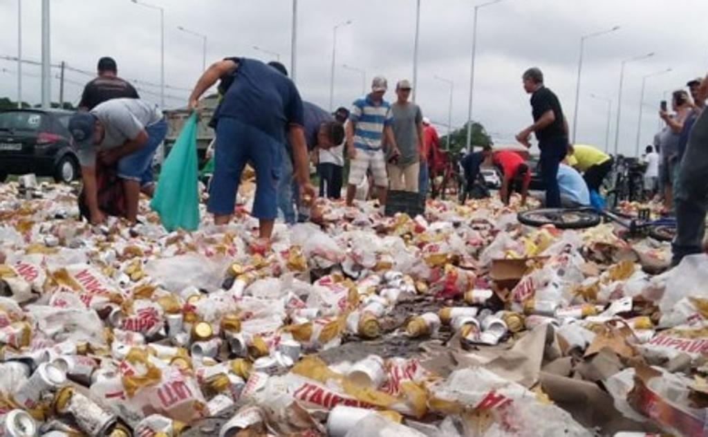 O tombamento da carga de um caminhão juntou uma multidão no meio da rodovia João Lepoldo Jacomel, entre Pinhais e Curitiba, na manhã desta quinta-feira (21). O aglomerado se formou depois que a carga - de fardos de cerveja - se espalhou pela pista. Praticamente toda a mercadoria foi saqueada. Às 10h20, o trânsito ainda era lento no trecho.
