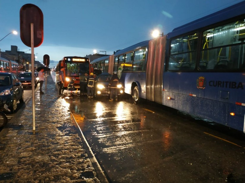 Um veículo de fora de Curitiba provocou um acidente incomum na noite desta quarta-feira (20). Sem saber que a via do meio da Avenida Marechal Floriano Peixoto, no Centro, era exclusiva para ônibus, o motorista entrou na pista e acabou atingido por um biarticulado. Como vinha outro ônibus pela canaleta, um Ligeirão, o veículo acabou prensado e arrastado por alguns metros entre os ônibus.