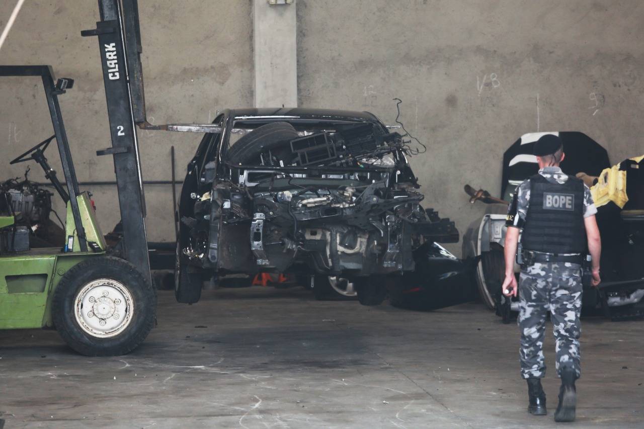 A equipe do Bope chegou ao barracão após receber denúncia de um veículo HB20 roubado em São José dos Pinhais, na região metropolitana. Já dentro do imóvel, os policiais encontraram, além do HB20, que já estava desmontado, um Chevrolet Cruize com placas clonadas e um par de placas de um veículo Tiguan, que já não estava mais lá. Ambos os carros tinham indicativo de furto.