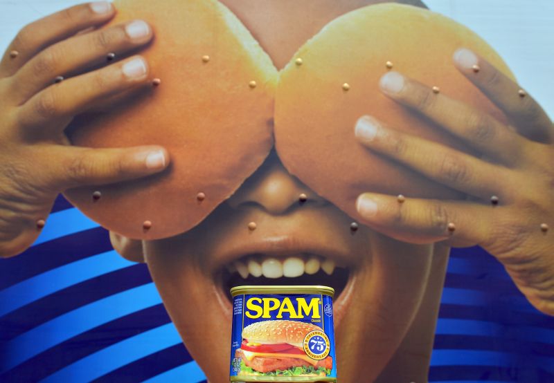 Desde a década de 1990 usa-se a expressão spam para descrever mensagens de lixo eletrônico. Originalmente, entretanto, ela se refere uma marca americana de carne enlatada, que está completando 75 anos de mercado este mês. Sua associação ao e-mail ocorreu por causa de um quadro do programa de tevê britânico Monty Python Flying Circus, no qual uma mulher conta que está enjoada de tanto comer Spam na Segunda Guerra, a carne enlatada era uma das poucas mercadorias imunes ao racionamento imposto pelo governo inglês. Na foto, uma lata ds Spam aparece em primeiro plano, com um caminhão de entregas ao fundo.
