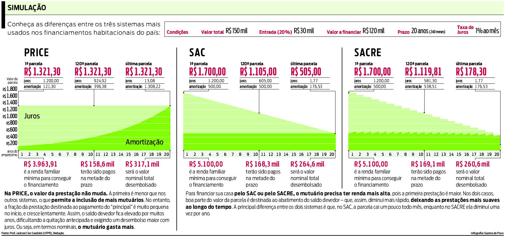 No SAC e no Sacre, a primeira prestação do mesmo imóvel seria de R$ 1,7 mil, valor acessível apenas a quem ganha pelo menos R$ 5,1 mil por mês. A contrapartida é que o saldo devedor, sobre o qual incidem os juros, é abatido mais rapidamente. Após 20 anos, o mutuário desembolsaria pouco mais de R$ 260 mil para pagar sua casa, ao passo que, pela Tabela Price, o gasto seria pelo menos 20% maior, de R$ 317 mil (veja quadro acima).