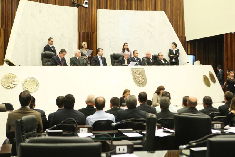 Na mesa, o presidente da Assembleia Legislativa do Paraná, Valdir Rossoni (ao centro), contou com a companhia do secretário de Comunicação do Governo, Marcelo Cattani (esquerda), e o presidente da Aerp, Márcio Villela (à direita), além de deputados estaduais. Na plateia estavam radiodifusores paranaenses.