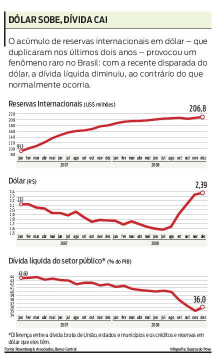 Um efeito curioso da crise foi que, ao elevar o valor das reservas internacionais do país, a disparada do dólar reduziu drasticamente a dívida líquida do setor público (diferença entre a dívida bruta de União, estados e municípios e a soma das reservas e créditos que eles têm a receber). Em agosto, a dívida líquida representava 40% do Produto Interno Bruto (PIB) nacional e, em apenas três meses, chegou a despencar para 35% o nível mais baixo desde maio de 1998. Só subiu para 36% no fechamento do ano por conta da emissão de R$ 14,5 bilhões em dívida federal, para a formação do Fundo Soberano.