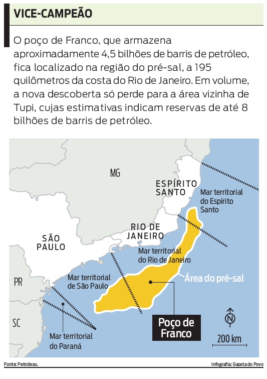 A Agência Nacional do Petróleo (ANP) anunciou ter encontrado um reservatório com volume estimado de 4,5 bilhões de barris de petróleo, na região do pré-sal, em área da União fora dos blocos já concedidos a empresas. Se confirmado, o poço, batizado de Franco, será o segundo maior do país, atrás apenas de Tupi, da Petrobras, que mantém entre 5 bilhões e 8 bilhões de barris.A perfuração foi feita pela Petrobras, a nordeste da região de Iara, na bacia de Santos, onde a estatal calcula que haja de 3 bilhões a 4 bilhões de barris de petróleo. Embora coletados pela estatal, os dados serão públicos porque foram obtidos em área da União.