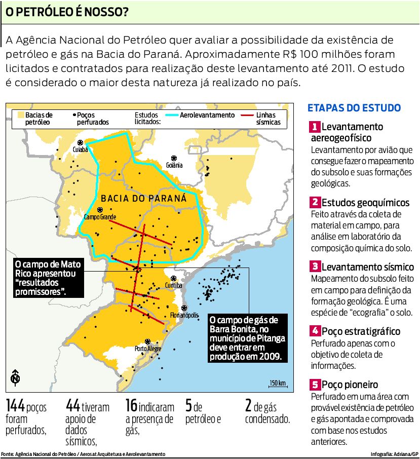 O Paraná está no mapa do mais audacioso plano já realizado na procura por petróleo no território brasileiro. O diretor-geral da Agência Nacional do Petróleo (ANP), Haroldo Lima, anunciou ontem, em Curitiba, o investimento de cerca de R$ 100 milhões em um estudo exploratório da Bacia do Paraná com o objetivo de encontrar óleo e gás na região. A área de 1,12 milhão de quilômetros quadrados, que abrange oito estados de Goiás ao Rio Grande do Sul, incluindo o Paraná , é a maior bacia sedimentar do território brasileiro, mas o conhecimento sobre o potencial petrolífero deste sistema ainda é considerado precário.