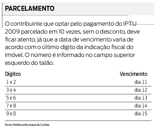 Quem optar pelo pagamento do imposto à vista deve fazê-lo até o dia 11 de fevereiro. As pessoas e empresas que quiserem fazer o pagamento parcelado precisam ficar atentas à data de vencimento, que varia de acordo com o último dígito da indicação fiscal do imóvel.