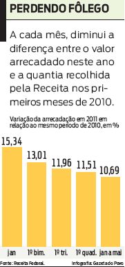 No entanto, o crescimento da arrecadação vem perdendo fôlego desde o início do ano em janeiro, a alta em relação a igual mês de 2010 havia sido de 15,3%. Para o secretário da Receita, Carlos Alberto Barreto, a expansão da arrecadação deve se estabilizar em torno de 10% neste ano.