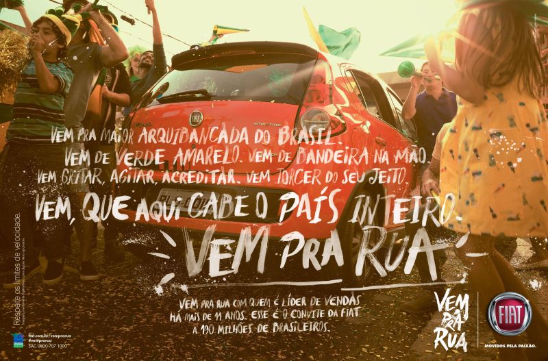 Depois que a trilha sonora de sua mais recente campanha, "Vem Pra Rua", se transformou em um dos hinos do movimento que toma conta do Brasil, a Fiat parou de estimular compartilhamentos nas redes sociais. No ar há quatro meses, a campanha acaba no sábado. As ações nas redes sociais, que deveriam continuar por mais tempo, foram reduzidas. A empresa parou de usar o símbolo de compartilhamento da campanha (#VemPraRua), que passou a ser usado nas redes sociais para convocar amigos para os protestos. "Criamos uma música pra chamar as pessoas para ir pra rua celebrar a Copa das Confederações, mas elas escolheram outros motivos para ir para a rua", diz o diretor de publicidade e marketing da Fiat Brasil, João Batista Ciaco. "Isso é ótimo. Caiu no gosto das pessoas. Mas não temos nada a ver com o movimento."