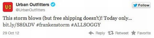 Várias empresas foram criticadas por tentar tirar proveito comercial do ciclone tropical Sandy, que atingiu Nova York em novembro. Algumas tiveram o cuidado de usar alertas como Stay safe (no sentido de fique seguro, proteja-se). Mas a gigante varejista Urban Outfitters pareceu pouco sensibilizada. Além de promover o envio gratuito de mercadoria, usou a hashtag #ALLSOGGY que significa tudo encharcado.