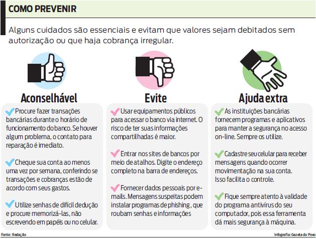 Essa é a principal medida de segurança para evitar fraudes e roubos em sua conta bancária. "É importante imprimir o extrato ou os comprovantes de transações porque esta é um prova concreta da movimentação. Muitas vezes você pode observar alguma irregularidade on-line e depois não conseguir mais identificar onde estava o erro", explica o delegado da Delcon, Jairo Estorilio.