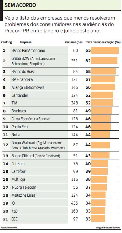 De acordo com o órgão, na maioria das audiências as empresas nem enviaram representantes, ou enviaram terceiros sem uma proposta de acordo. Nos 134 dias úteis do ano até julho, o PanAmericano foi alvo de 60 queixas de consumidores paranaenses. Dessas, 39 (65%) não foram solucionadas. O Grupo B2W recebeu 251 reclamações e 155 (62%) não foram resolvidas. Contra o Banco do Brasil foram 84 reclamações e 49 (58%) ficaram sem solução.