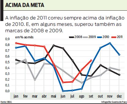 O Banco Central divulgou na quinta-feira a ata da última reunião do Comitê de Política Monetária (Copom), realizada no dia 19. Nessa reunião, pela segunda vez seguida, o Copom reduziu a taxa nominal de juros (Selic) em 0,5 ponto porcentual. Em três meses, a Selic caiu de 12,5% para 11,5%. Ao mesmo tempo, a taxa de inflação persiste em níveis elevados. Isso pode ser visto no gráfico desta página, observando-se que a inflação de 2011 (linha vermelha) correu sempre acima da inflação de 2010 (linha azul) e também acima das demais no começo do ano e nos meses de agosto e setembro. Retrospectivamente, a inflação de 2011 é a maior dos últimos quatro anos. Isso é um fato.