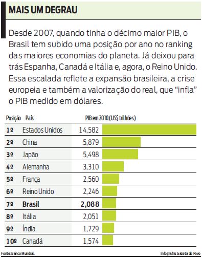 O Brasil superou o Reino Unido e ocupa agora o posto de sexta maior economia do mundo, reportou o jornal britânico The Guardian, citando uma equipe de economistas. A crise bancária de 2008 e a subsequente recessão deixou o Reino Unido no sétimo lugar em 2011, atrás da maior economia da América do Sul, que cresceu rapidamente no rastro das exportações para a China e o Extremo Oriente.
