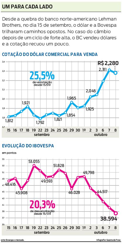 O Banco Central fez ontem mais dois movimentos para conter os efeitos da crise global. Pela primeira vez em mais de cinco anos, o BC realizou um leilão de dólares das reservas internacionais, na tentativa de segurar a disparada da moeda americana, que chegou a ser vendida a R$ 2,48 pela manhã. Com a investida da autoridade monetária, o dólar recuou e fechou o dia em R$ 2,28, queda de 1,34% em relação ao dia anterior. No início da noite, o BC ainda promoveu novos ajustes no recolhimento compulsório de depósitos bancários medidas que injetarão um total de R$ 23,2 bilhões na economia (leia mais ao lado).