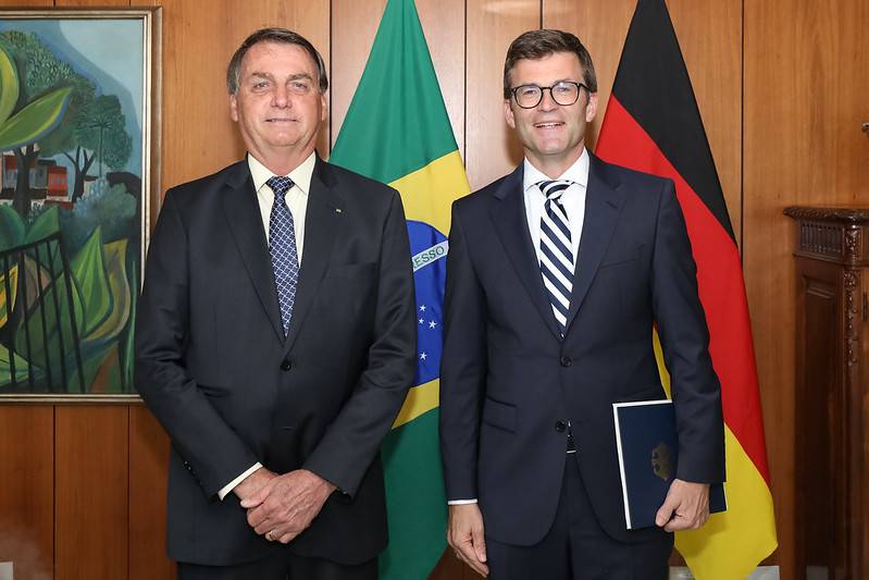 Depois de receber as credenciais do novo embaixador da Alemanha no Brasil, Heiko Thoms, o presidente Jair Bolsonaro voltou a defender a assinatura do acordo de livre-comércio entre o Mercosul e a União Europeia, que depende da ratificação de todos os países do bloco. O tratado tem sido criticado no exterior por grupos que questionam a política ambiental do Brasil e o aumento do desmatamento na região amazônica. "Reafirmamos nosso interesse de aprofundar a parceria econômica e de assinar o Acordo Mercosul-União Europeia", disse Bolsonaro pelo Twitter. No ano passado, declarações de Bolsonaro sobre o Fundo Amazônia, que tem a Alemanha como um dos investidores, causaram mal estar entre os países. Em agosto de 2019, o presidente disse que a Alemanha "vai deixar de comprar à prestação a Amazônia", ao comentar a suspensão dos investimentos do país europeu. Agora, o governo brasileiro tenta retomar os investimentos. Os embaixadores da Armênia, Arman Akopian, e da Argentina, Daniel Scioli, também apresentaram as suas credenciais na manhã desta quarta-feira (19).