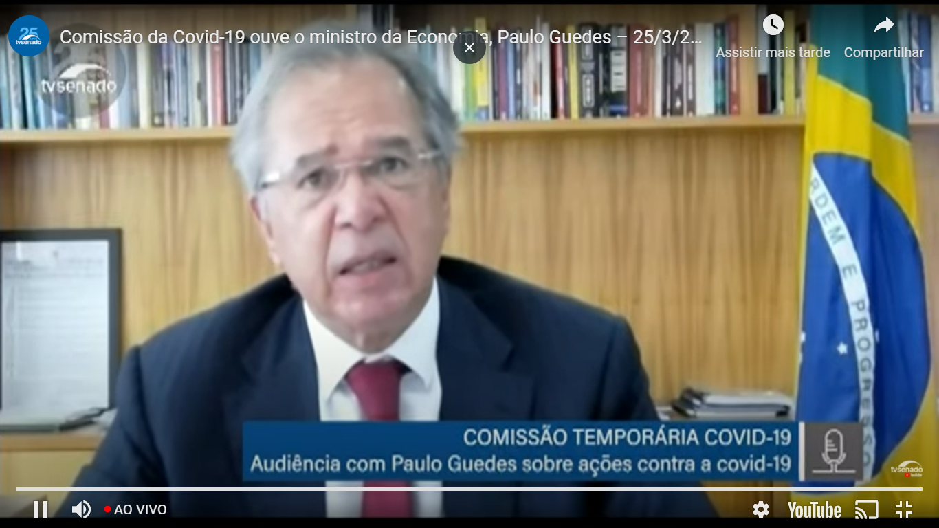 O ministro da Economia, Paulo Guedes, defendeu nesta quinta-feira (25) a compra de vacinas contra a Covid-19 pelo setor privado, com posterior doação parcial ao Sistema Único de Saúde (SUS). As declarações foram feitas durante audiência pública virtual da comissão temporária do Senado para debater a Covid-19.