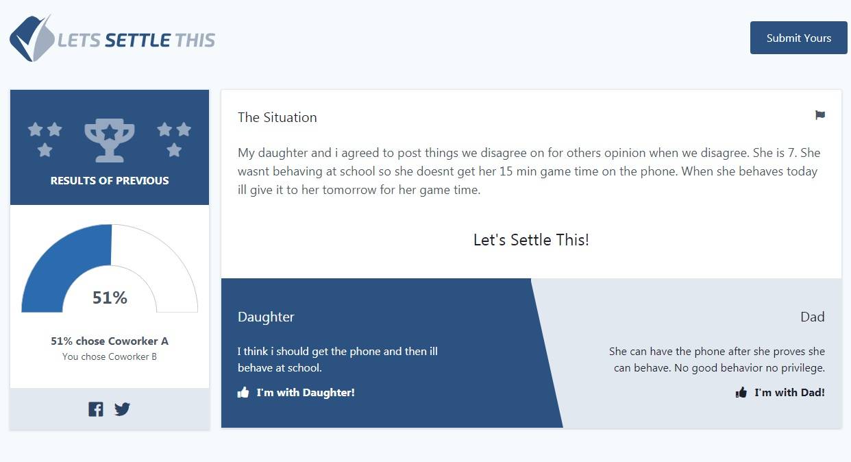 Você tem um dilema e não sabe como resolver? A solução pode estar na internet. O site Let’s Settle This (vamos resolver isso, em tradução livre) foi criado justamente com essa finalidade. Ele funciona do seguinte modo: primeiro, você descreve seu problema. Um exemplo real, presente no site: “minha namorada entregou o final de Vingadores: Ultimato porque estava brava porque eu não lavei a roupa. Devo terminar com ela?”.