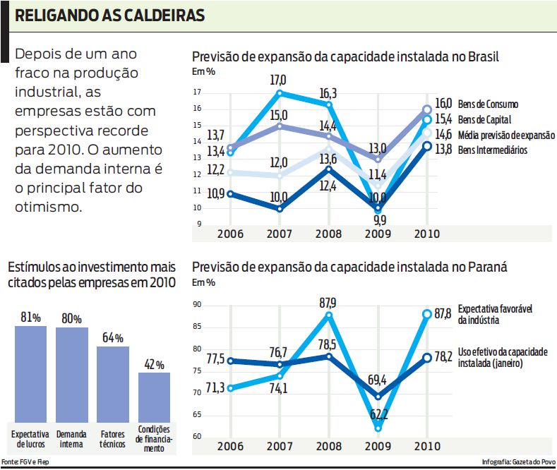 Os números reforçam pesquisas regionais recentes que mostram a confiança do empresariado na demanda pós-crise. A 14ª Sondagem Industrial da Federação das Indústrias do Estado do Paraná (Fiep) mostrou uma retomada dos investimentos igual à de 2008, quando o índice de otimismo dos empresários paranaenses encostou em 88%. O Panorama Empresarial, da consultoria Deloitte, apontou que 94% das empresas da região Sul esperam crescimento da receita em 2010.