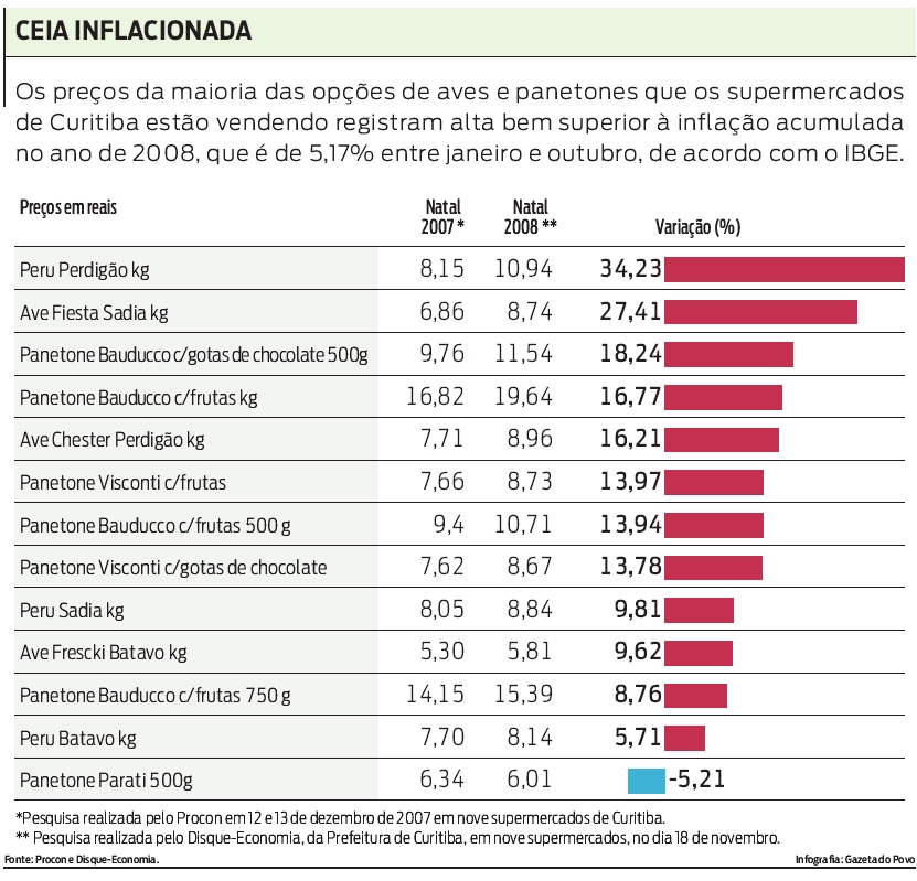 Entre os produtos que vão elevar os custos da ceia de fim de ano estão as aves típicas de Natal e os panetones. Ainda não há produto em todos os mercados, mas, onde ele chegou, a alta foi expressiva. O peru da Perdigão, por exemplo, que no ano passado custava, em média, R$ 8,15 o quilo, é encontrado hoje por R$ 10,94. No geral, os panetones sofreram aumentos de 8% a 18%.