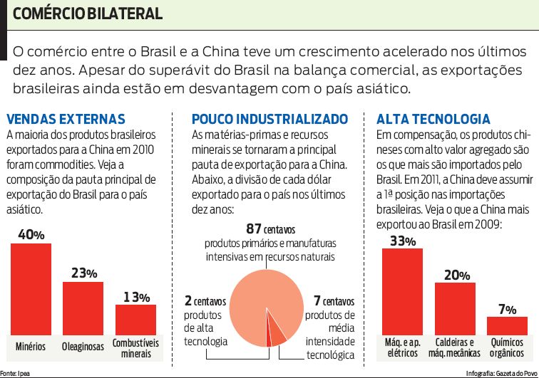 O documento do Ipea faz esse alerta baseado na pauta de exportações e importações brasileiras. Em 2010, os minérios corresponderam a 40% do que foi vendido para a China; 23% foram oleaginosas e 13%, combustíveis minerais. Em compensação, os produtos chineses com alto valor agregado como equipamentos industriais são os mais importados pelo Brasil.