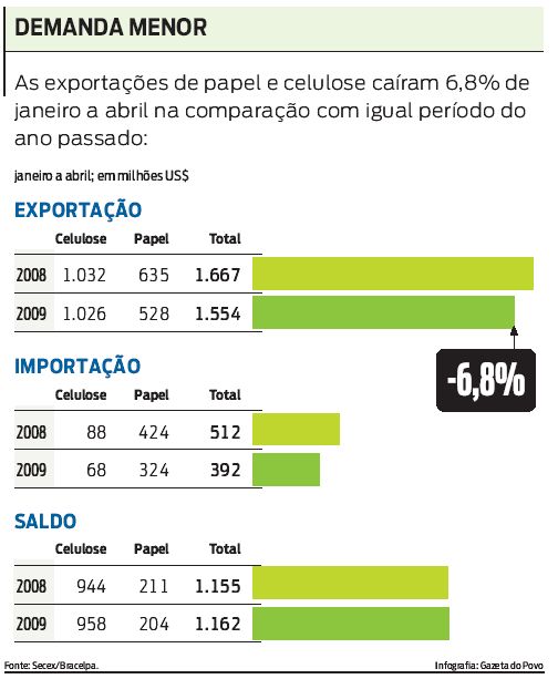 Apesar da reação das exportações chinesas, a desvalorização da moeda norte-americana nas últimas semanas já ameaça o plano do setor de repetir o desempenho do ano passado, quando as vendas externas somaram US$ 5,8 bilhões, 17% do superávit brasileiro. "Teremos que vender muito mais em volume, em um cenário de demanda reprimida, preços baixos e crise internacional, para podermos manter os níveis do ano passado, quando o Brasil conseguiu passar de sexto para quarto maior produtor mundial de celulose", afirma. A crise afetou a demanda dos principais clientes do setor lá fora Estados Unidos e Ásia com forte queda nos preços internacionais. Apesar da ligeira recuperação em alguns mercados, o preço da celulose continua 35% inferior ao período pré-crise, quando chegou a bater a marca de US$ 850 a tonelada. "O que víamos em 2008 não vai mais se repetir. Aquele mundo acabou", diz Elizabeth.