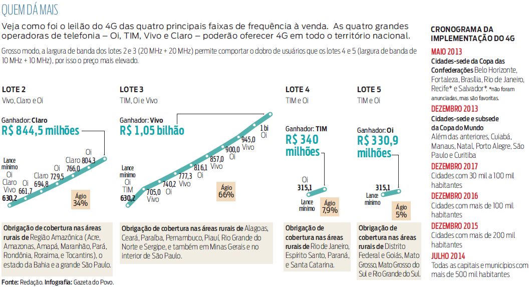 Claro e Vivo mostraram maior capacidade de investimento, arrematando os dois principais lotes da faixa de 2,5 Ghz, frequência que será destinada ao sistema 4G no Brasil. Elas pagaram R$ 804 milhões e R$ 1,05 bilhão, respectivamente, pelas licenças de 20 MHz + 20MHz. TIM e Oi compraram lotes de menor potência, de 10 MHz + 10MHz, e pagaram R$ 340 milhões e R$ 331 milhões. O dinheiro arrecadado vai para o Tesouro Nacional.