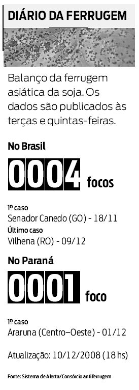 Em números de casos registrados, a situação da ferrugem asiática, no atual ciclo da soja no Paraná, é a mesma da safra anterior. Até ontem, foram quatro casos no país e apenas um no estado. A preocupação agora é com a previsão meteorológica, que começa a indicar chuva em praticamente todo o Paraná. A umidade favorece a manifestação e proliferação do fungo que provoca a doença.