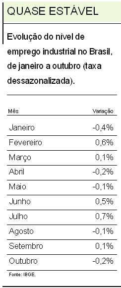O IBGE deve divulgar hoje os dados sobre o emprego na indústria em novembro. A estatística já deve incluir alguma coisa dos efeitos da crise, embora não a parte mais crua esta só deve aparecer no mês que vem, quando o instituto anunciar os dados de dezembro (há sinais de que, na economia como um todo, algo como 600 mil vagas tenham sido fechadas no mês passado). Mas já deve haver números bem ruins. A tabela ao lado mostra a evolução de janeiro a outubro.