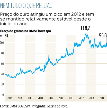De uma lista de 30 categorias de investimento classificados por rentabilidade, o ouro ficou em 26.º lugar no mês passado. Seu desempenho foi negativo: desvalorizou-se em 2,1%. Depois de uma escalada impressionante a partir de meados de 2008 até meados de 2012, o metal perdeu um tanto de seu valor e passou a "andar de lado", como se diz no mercado ou seja, se manteve relativamente constante, sem grandes variações para cima ou para baixo. Veja no gráfico a evolução dos preços nos últimos dez anos.