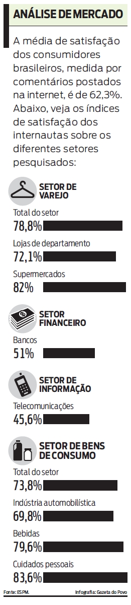 De acordo com as informações da primeira pesquisa, 62,3% dos consumidores estão satisfeitos com produtos e serviços de quatro setores da economia, formados por sete subsetores e 28 empresas. Entre os setores que receberam as piores avaliações estão informação (empresas de telecomunicações), com apenas 45,6% de satisfação; e financeiro (bancos), com 51%. Varejo e bens de consumo foram mais bem avaliados.