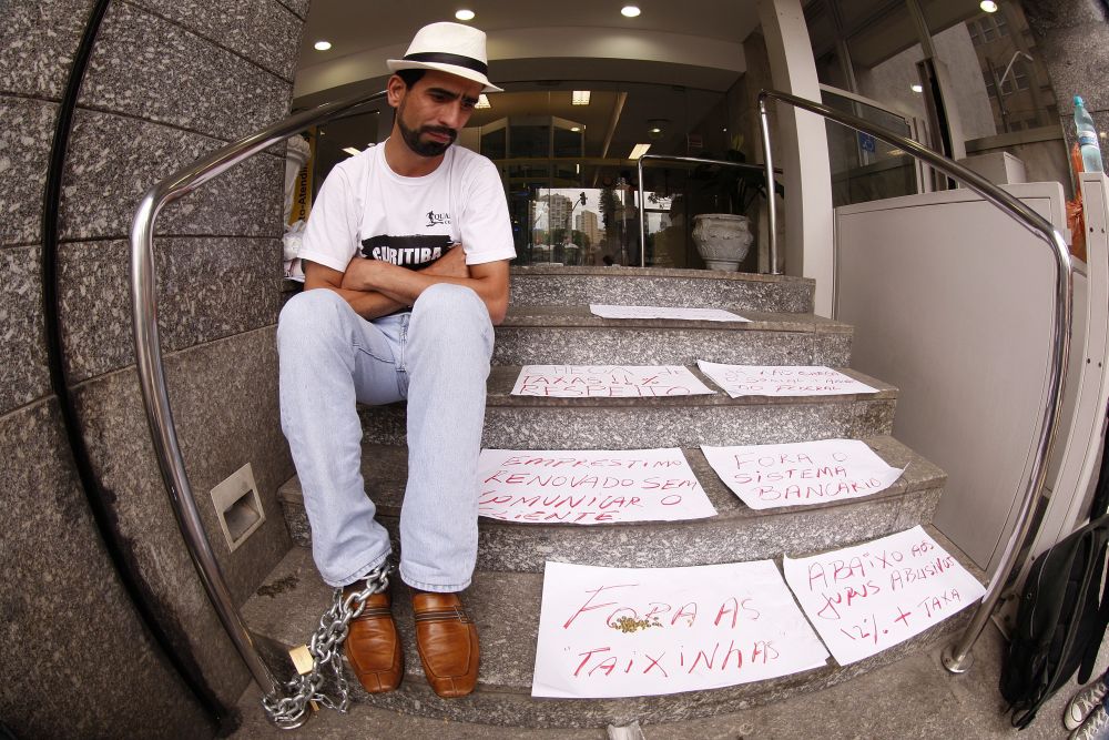 Um comerciante protestou em frente a uma agência do Banco do Brasil localizada na Praça Tiradentes, no Centro de Curitiba, por nove horas desta terça-feira (11), contra supostas taxas abusivas que o banco estaria cobrando dele. Proprietário do bar O Torto, no bairro São Francisco, Arlindo Ventura, 39 anos, também afirma que o banco estaria renovando financiamentos em seu nome sem consultá-lo, além de sumir com parte do dinheiro depositado em sua conta.