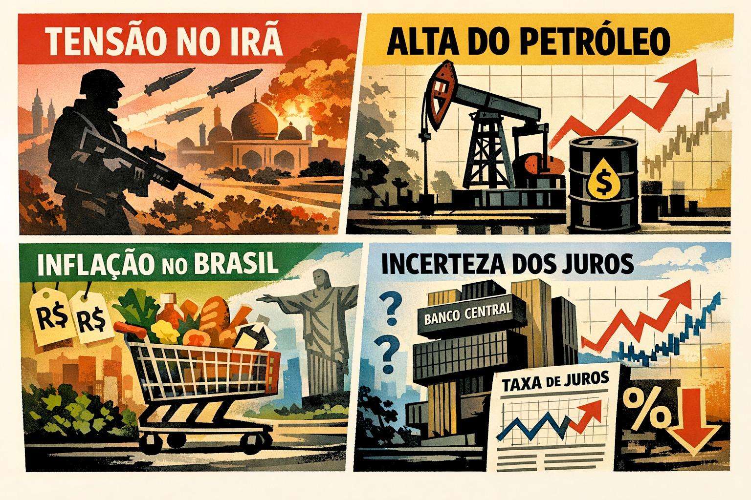 O Irã está perto do Estreito de Ormuz, por onde passa 20% do petróleo do mundo. Com a guerra, o preço do barril sobe. Como o petróleo é usado para fazer combustível e transportar produtos, tudo fica mais caro por aqui. Além disso, a instabilidade faz investidores tirarem dinheiro do Brasil, o que aumenta o valor do dólar.