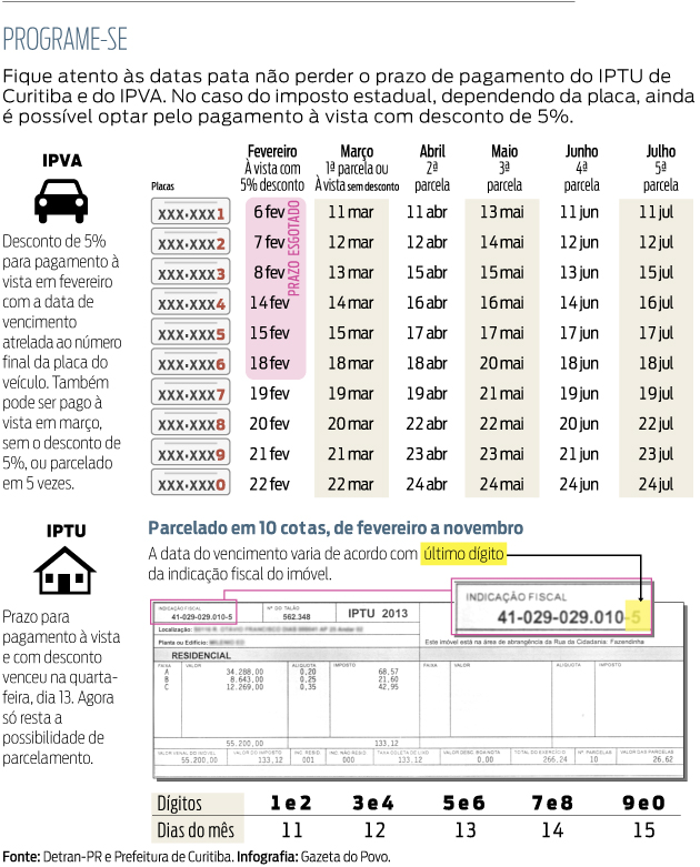 Nesta terça-feira (19), encerra último dia para o pagamento do IPVA à vista, com desconto de 5%, para veículos com placa final 7. Na quarta-feira (20) o prazo termina para veículos com placa final 8. Na quinta-feira (21) é a vez das placas final 9 e na sexta-feira (22) encerra o prazo para placas final 0. Em março, ainda será possível efetuar o pagamento à vista, porém, sem a vantagem do desconto. (Confira os prazos na tabela abaixo)