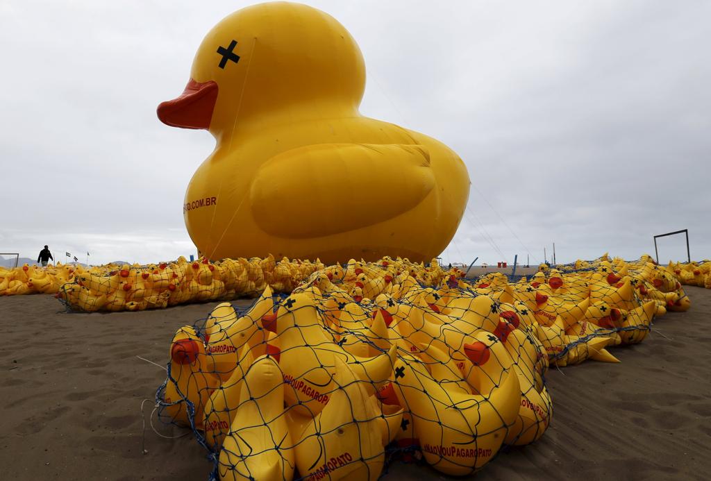 O símbolo da campanha “Não vou pagar o pato”, em protesto contra o aumento de impostos, foi instalado na Praia de Copacabana, na zonal do sul do Rio, neste domingo (25). O pato inflável gigante, de 12 metros, já percorreu diversas cidades desde setembro. Além do pato inflável, 2 mil patinhos foram distribuídos. O objetivo dos organizadores é barrar a criação de novos impostos. Entre eles, a principal iniciativa a ser derrubada é a nova CMPF, já proposta pelo governo para aumentar a arrecadação. Na internet, até o momento, a campanha já recolheu cerca de 800 mil assinaturas. A meta é chegar a um milhão, para depois encaminhar ao Congresso Nacional.