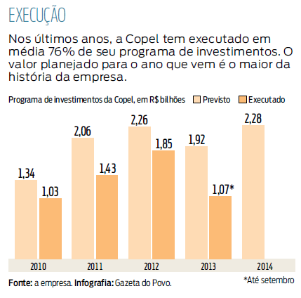 O programa de investimentos da Copel em 2014, anunciado ontem, é de R$ 2,28 bilhões valor que, se confirmado, será o maior da história da companhia. Mas ela não conseguiu executar todo o programado nos últimos anos. De 2010 a 2012, investiu em média 76% do planejado.