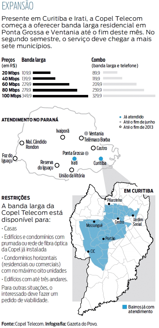 A Copel Telecom quer levar seu serviço de internet residencial a mais nove cidades do Paraná neste ano. A empresa, braço de telecomunicações da companhia elétrica, entrou no "varejo" da banda larga há alguns meses e atua hoje em Curitiba e Irati, no Centro-Sul. Até o fim do mês, deve chegar a Ponta Grossa e Ventania, nos Campos Gerais, e, no segundo semestre, a outros sete municípios, de várias regiões do estado.