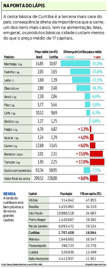 A cesta básica de Curitiba tem um dos valores mais altos: R$ 228, o segundo maior entre 17 capitais pesquisadas. No entanto, observando com mais detalhe os itens que compõem a alimentação básica, vê-se que os preços dos produtos estão, em geral, abaixo da média nacional. Dos 13 produtos que fazem parte da cesta, 8 deles são mais baratos em Curitiba. Mas, como os itens mais caros carne, feijão e tomate são aqueles que têm grande participação na alimentação familiar, a cesta curitibana figura como uma das mais caras do país.