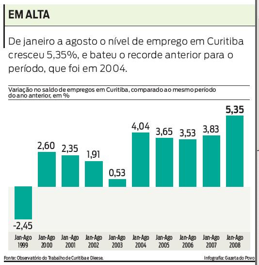 De janeiro a julho deste ano, a criação de empregos formais na capital cresceu 5,35%, batendo a variação de 4,04% que havia sido registrada em 2004. Em 12 meses, a expansão na capital é de 7,07%, em linha com o aumento observado em todo o Paraná, de 7,17%.