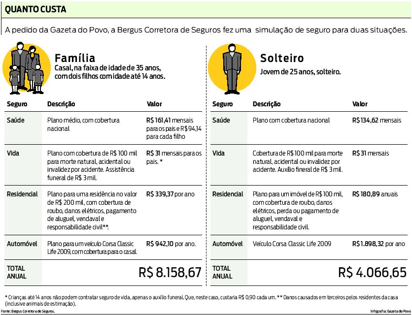 Gastos com seguros se tornaram um item relevante na organização do orçamento doméstico. Uma família de classe média curitibana com dois filhos, carro e apartamento próprios gasta cerca de R$ 8 mil por ano se fizer seguros de vida, de saúde, do carro e da casa. Já um jovem solteiro que vive na mesma cidade precisa desembolsar a metade, cerca de R$ 4 mil anualmente.