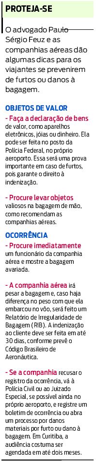 Nem mesmo os quatro lacres, um para cada zíper, que o comerciário Emerson Rezende colocou em sua mochila serviram para proteger sua bagagem. Nenhum deles chegou ileso à esteira do Aeroporto de Goiânia, onde Rezende desembarcou depois de uma viagem entre Curitiba e a capital de Goiás, feita em um avião da Gol no início de outubro. "Quando vi a mala e os quatro lacres arrombados, fui direto no bolso em que estava minha máquina fotográfica e vi que ela não estava mais lá. Só sobrou a capinha", lembra o passageiro. A responsabilidade pelo furto ou dano a bagagens, diz o Código Brasileiro de Aeronáutica (CBA), é da companhia aérea, mas o ressarcimento só será feito se houver diferença no peso da mala condição que obriga o consumidor a se precaver para garantir a indenização.