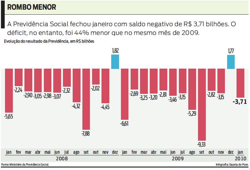 As contas da Previdência Social abriram o ano com queda de 44% no déficit em relação ao mesmo período de 2009. O saldo negativo atingiu R$ 3,7 bilhões, o que representa o melhor resultado para meses de janeiro nos últimos dois anos. O principal motivo para a redução do rombo previdenciário foi a diminuição dos gastos com sentenças judiciais. Em janeiro do ano passado, a Justiça determinou o pagamento de R$ 3,2 bilhões em ações contra a Previdência. Em janeiro de 2008, as decisões judiciais haviam somado R$ 2,4 bilhões. No mês passado, esse valor limitou-se a R$ 225 milhões.
