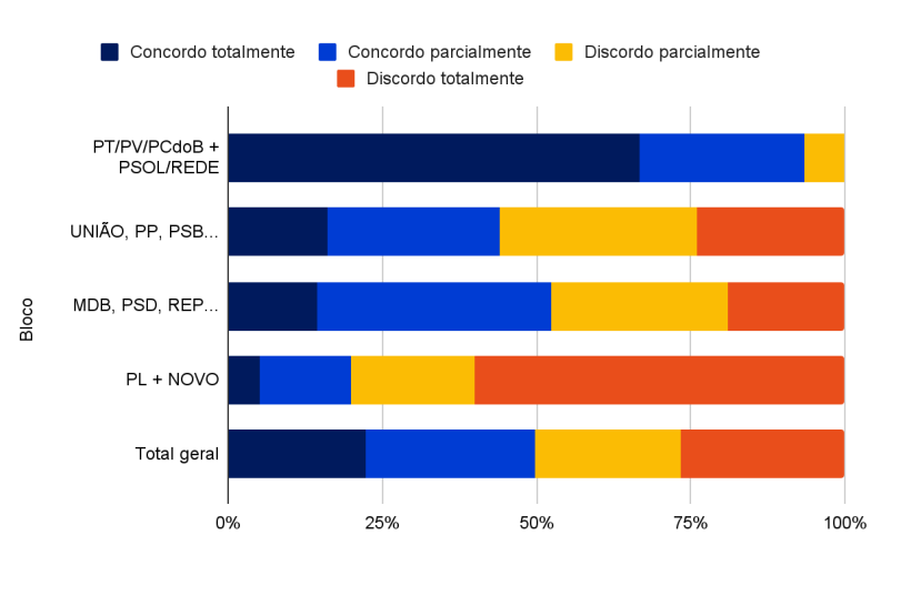 Por outro lado, 22,3% dos deputados concordam totalmente com a agenda e 27,4% concordam parcialmente.