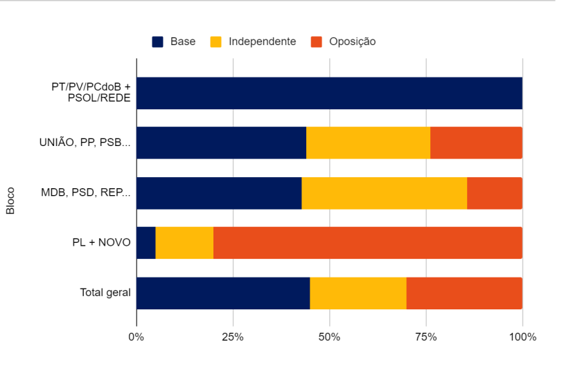 Em relação ao levantamento anterior, feito em agosto de 2023, os pesquisadores também registraram um aumento de 4,6% no número de parlamentares que se identificam como “Base” e uma redução de 3,5% no número de deputados que se dizem “Oposição”.