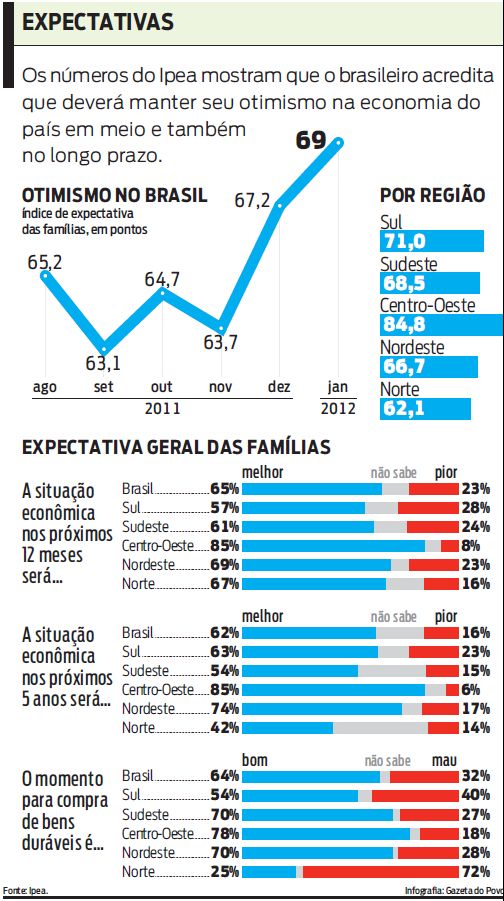 O brasileiro começou o ano otimista quanto à situação socioeconômica do país. Em janeiro, o Índice de Expectativas das Famílias, estudo apresentado mensalmente pelo Instituto de Pesquisa Economia Aplicada (Ipea), chegou a 69 pontos, recorde da ainda recente série histórica iniciada pelo órgão em agosto de 2010. Em dezembro, o índice havia sido de 67,2, mesma marca de janeiro de 2011. A região brasileira que concentra o maior otimismo é o Centro-Oeste, que chegou a 84,8 pontos, seguida pelo Sul, com 71. O Norte registrou as expectativas mais baixas, somando 62,1 pontos.