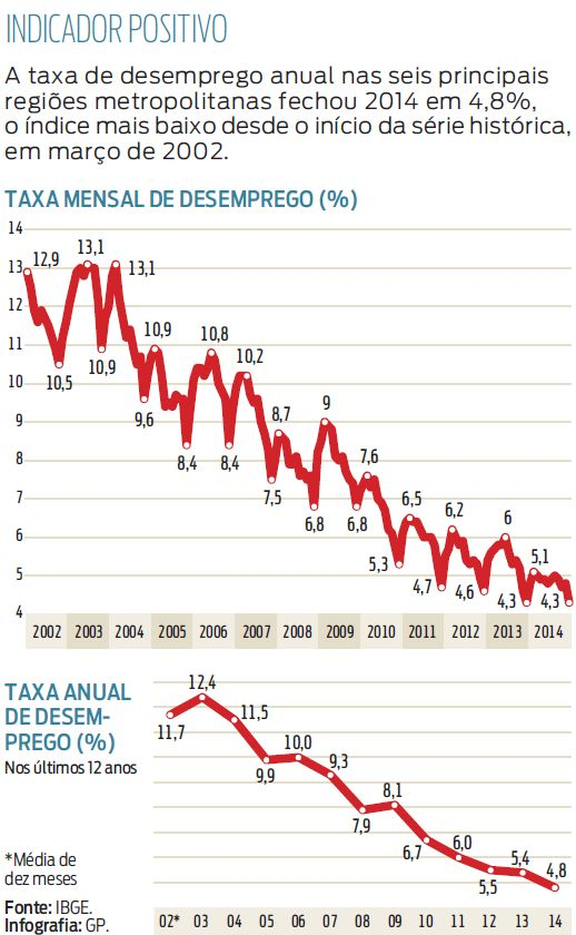 A taxa de desemprego nas seis principais regiões metropolitanas do país caiu para 4,3% em dezembro, se igualando à mínima histórica registrada em dezembro de 2013, informou ontem o Instituto Brasileiro de Geografia e Estatística (IBGE). A taxa média para o ano de 2014 ficou em 4,8%, também a menor da série histórica anual da Pesquisa Mensal de Emprego, com início em março de 2020.